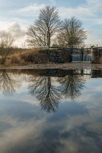 Instead of driving straight home, we turned off the motorway and parked near Haggs. From there we had a walk along the Forth and Clyde canal. The weather held up and with a few fluffy clouds in the sky and an almost perfectly flat calm on the canal we walked along the canal, heading east. Beautiful reflections on the still water gave me plenty of opportunity for photos. Even when we passed one of the locks, the water stayed still and allowed more photo opportunities.