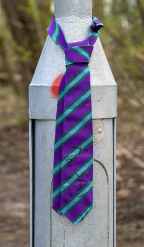 I took a camera and lens out for a walk in St Mo’s when we got home and got a photo of a school tie hanging from a lamp post. I don’t know what the scribbles on the tie were, but just to be safe, I removed some of the writing.