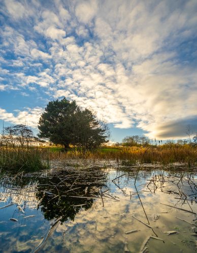 In the afternoon I managed a walk around St Mo’s to get some photos. The cloudscape was very nice, but by 4pm the sun was heading towards the horizon and the colours were changing. My favourite photo was another of the reflection shots I’ve become attached to. This time it was taken with the Sony 10-18mm lens. It’s really an APS-C lens, but it works magnificently on the full frame camera. It became PoD and was a shot looking across the flooded pond to a beautiful skyscape.