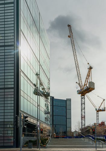 PoD went to cranes reflected in a new glass-fronted building in the city.
