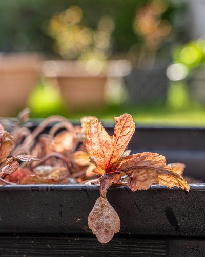 We drove through a couple of heavy rain showers, what Scamp calls the Cumbersheugh Cloud. There were plenty of clouds too, so I decided to work on the computer for a while until the weather improved. Meanwhile Scamp was doing a bit of cleaning. About an hour later the sky cleared and I went for a walk in St Mo’s and got a few shots. It wasn’t until I got home, I saw a better subject than I’d found on my walk. Just a Tiarella plant hanging over the edge of a pot in our garden. A few photos later I was happy with my results.