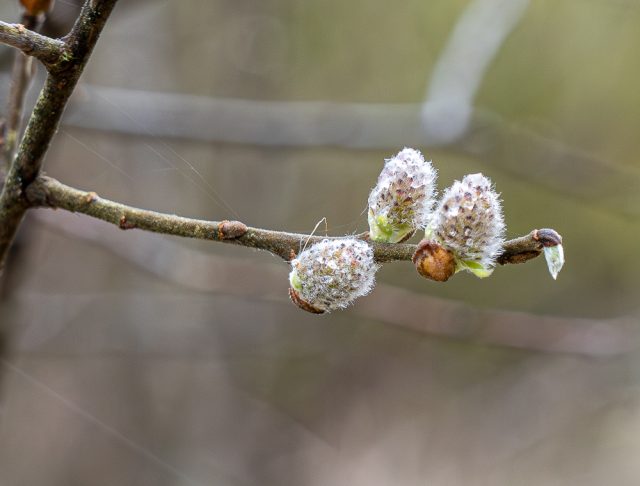 Scamp was out in the morning for coffee with Shona. I stayed home and left the ladies to their discussions. When Scamp returned, I decided to risk a walk. I was barely out the front door when the raindrops started falling. It’ll be fine, I said and walked over to St Mo’s, but the rain kept coming and by the time I was halfway round my walk, I turned back, but by that time my Rab jacket was quite wet. There was nothing to do but get home as soon as I could. By the time I got back, I had to do a complete change of clothes. However, I got today’s PoD which was a trio of Catkins on a branch.