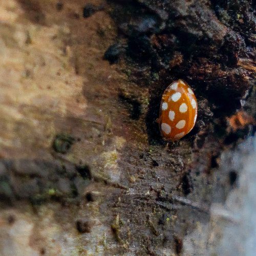 Actually, today was quite a clear day. Plenty of blue skies and light clouds, but cold. I went out later to see if there was anything worth photographing. I don’t know why I went for a walk in the woods, clambering over fallen trees everywhere. Halfway through my walk I found an old friend. It’s an Orange Sixteen Spot Ladybird (Halyzia sedecimguttata) to give it its posh Sunday name. Just about the length of the nail on my ring finger and tucked into a crevice in a tree. Apparently they don’t feed on aphids like most ladybirds, but on mildew on trees like oak, sycamore and ash. It’s amazing what you find out when you go walking through the woods. That was my PoD.