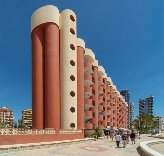 We walked round the bay almost to the Peñón de Ifach (Calpe Rock) which is a 332-meter high limestone mountain. We walked back to the town, admiring the amazing architecture, especially the great brown tubes with circular holes which were rooms in a complex.