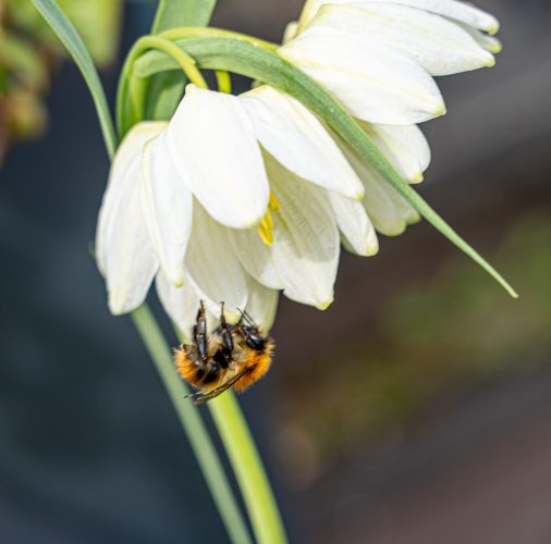 I had a wander around the front garden after that and noticed a bee on one of the Snake’s Head Fritillaries that Scamp had planted last spring. This was the first bee I’d seen in the garden this year, so I grabbed my camera and got its photo. I’m still not sure what kind of bee but Mr Google insists it’s a Common Carder Bee (Bombus pascuorum) I’ll take his word for it. Itseemed quite interested in a few of the flowers in the front garden before buzzing off to tell all of its Carder Bee pals where the good flowers were. The place will be buzzing with them tomorrow. I must be feeling better tonight because the jokes are getting worse.